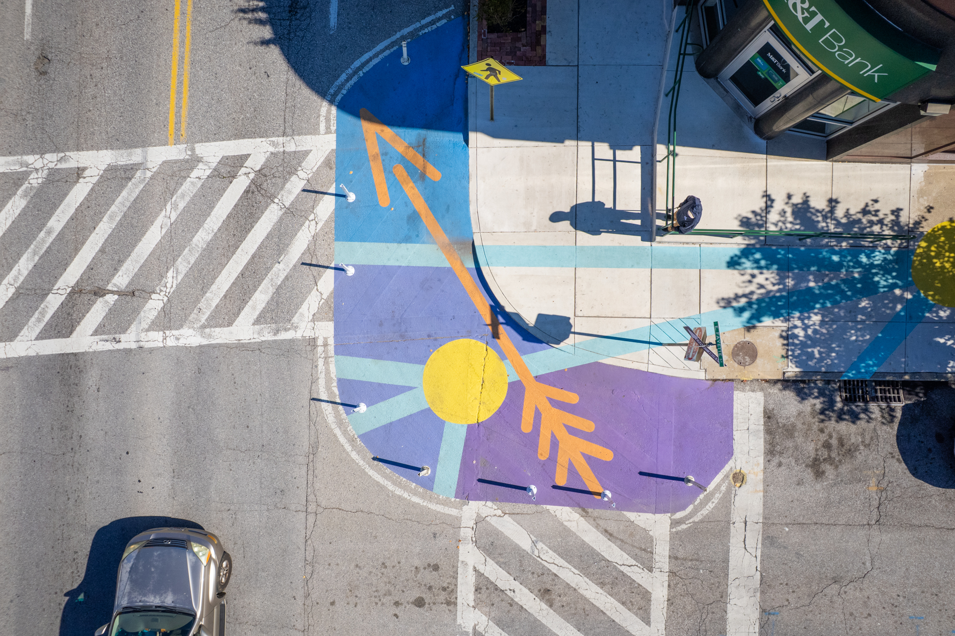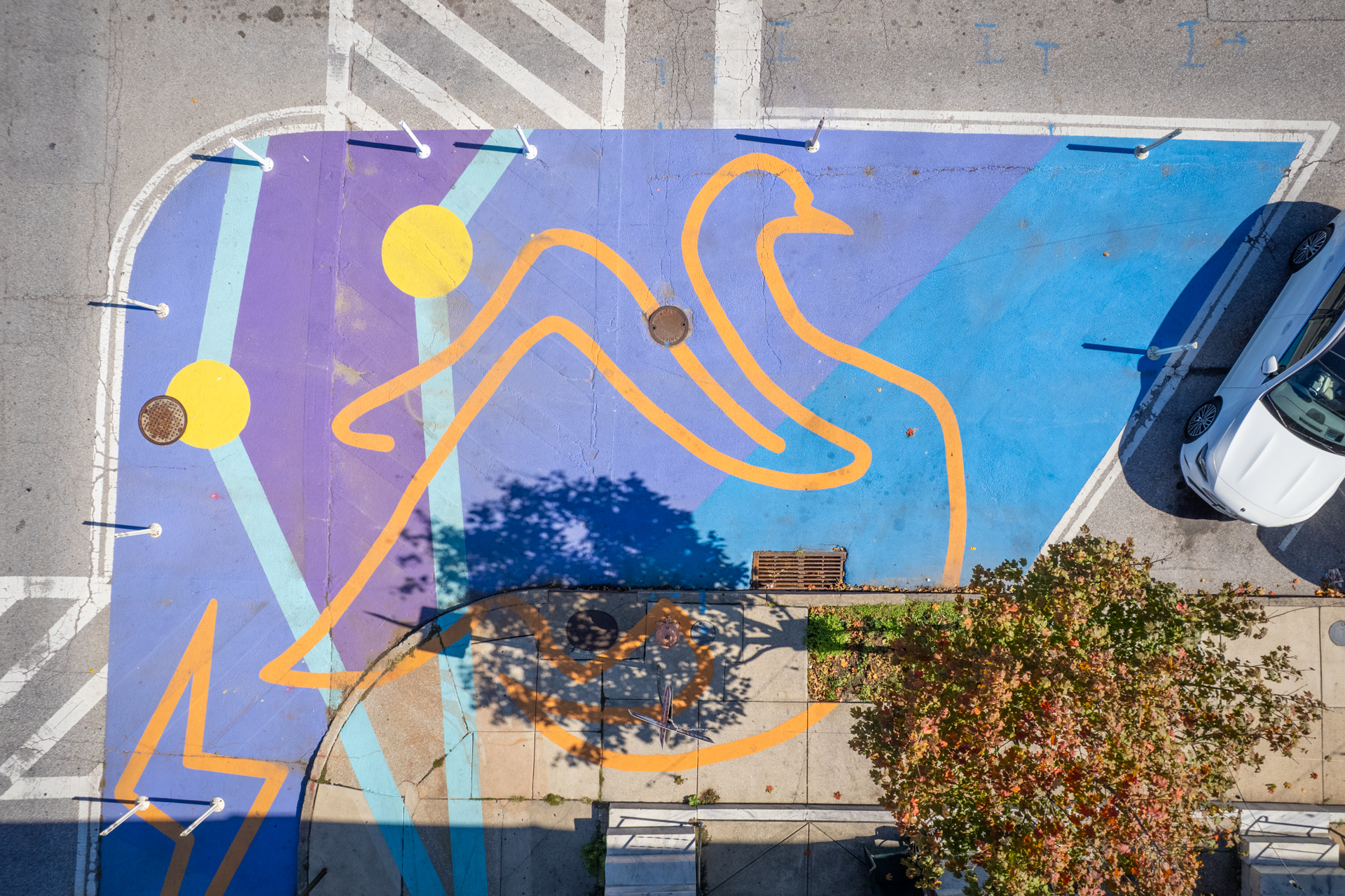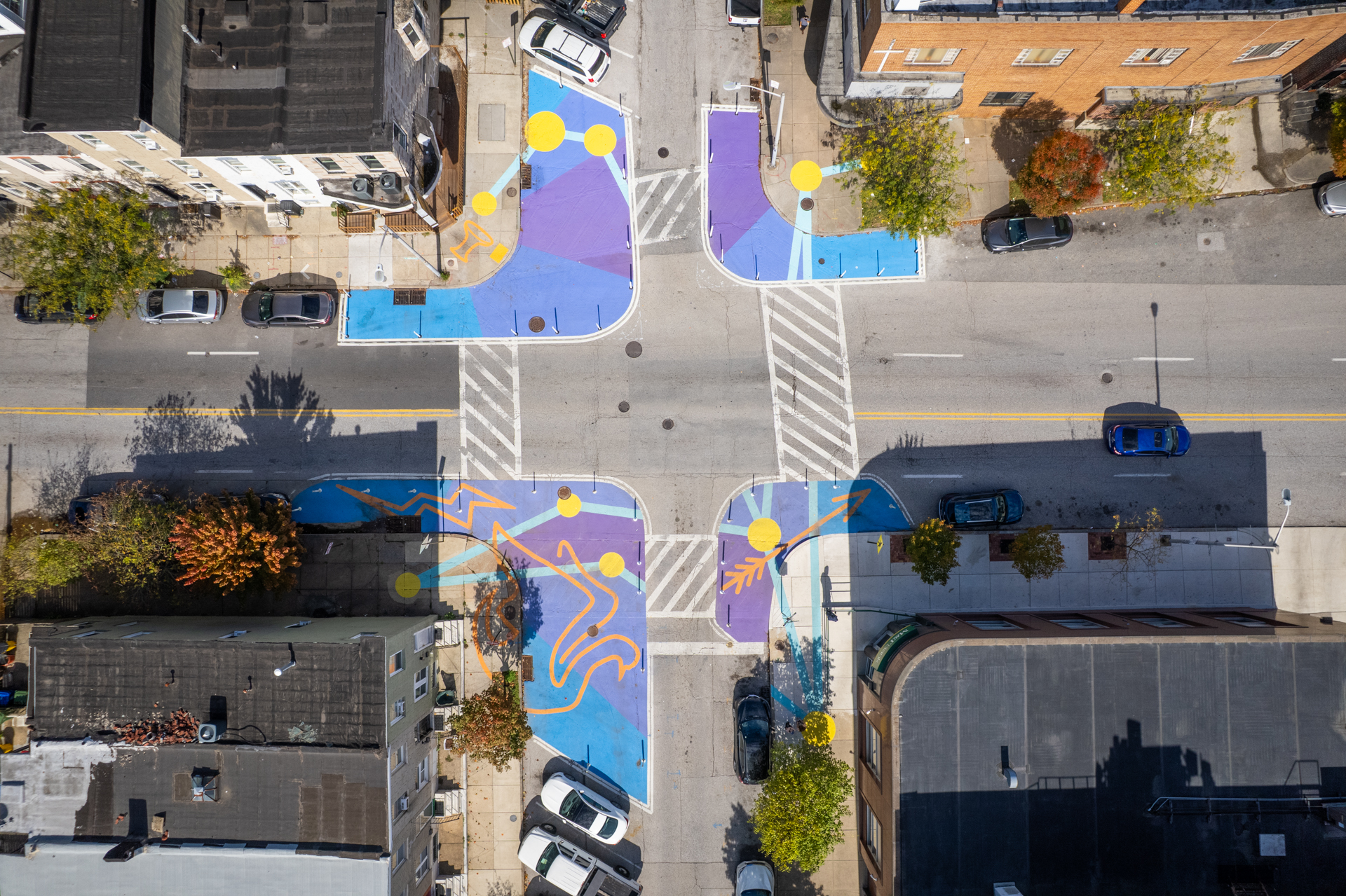 The chosen design Aquila Constellation brings color and calm to the busy intersection. Translated from English to Latin, the eagle mascot of nearby Paca Elementary School becomes the namesake of classic star constellation, Aquila. The Aquila Constellation spreads its celestial wings across the intersection through bright yellow stars connected by turquoise lines, set amidst an indigo blue sky filling the bump outs. Orange outlines make mythological references to the sky drawing; including Zeus as a Swan, his famous thunderbolt, Ganymede’s cup, and Cupid’s arrow.