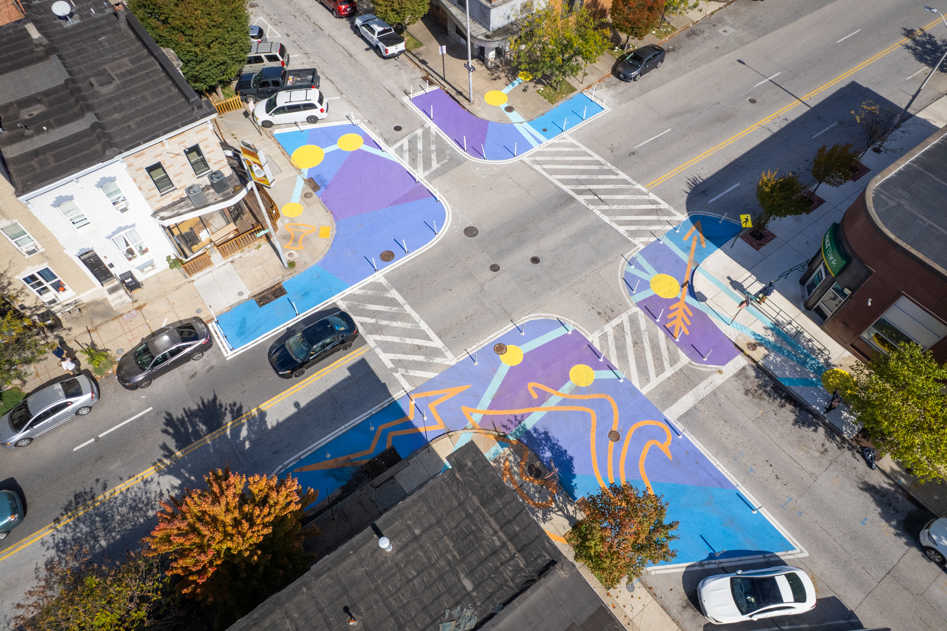 Patterson Park Neighborhood Association and Southeast CDC partnered with Graham Projects to engineer, design, and install traffic calming and pavement art to improve pedestrian safety at the intersection of Fayette Street and Luzerne Avenue in East Baltimore. Graham Projects collaborated with artist Nichol Buchholz of Sol Raya Public Space to lead a community-based design process that resulted in the Aquila Constellation street mural now wrapping the intersection.
