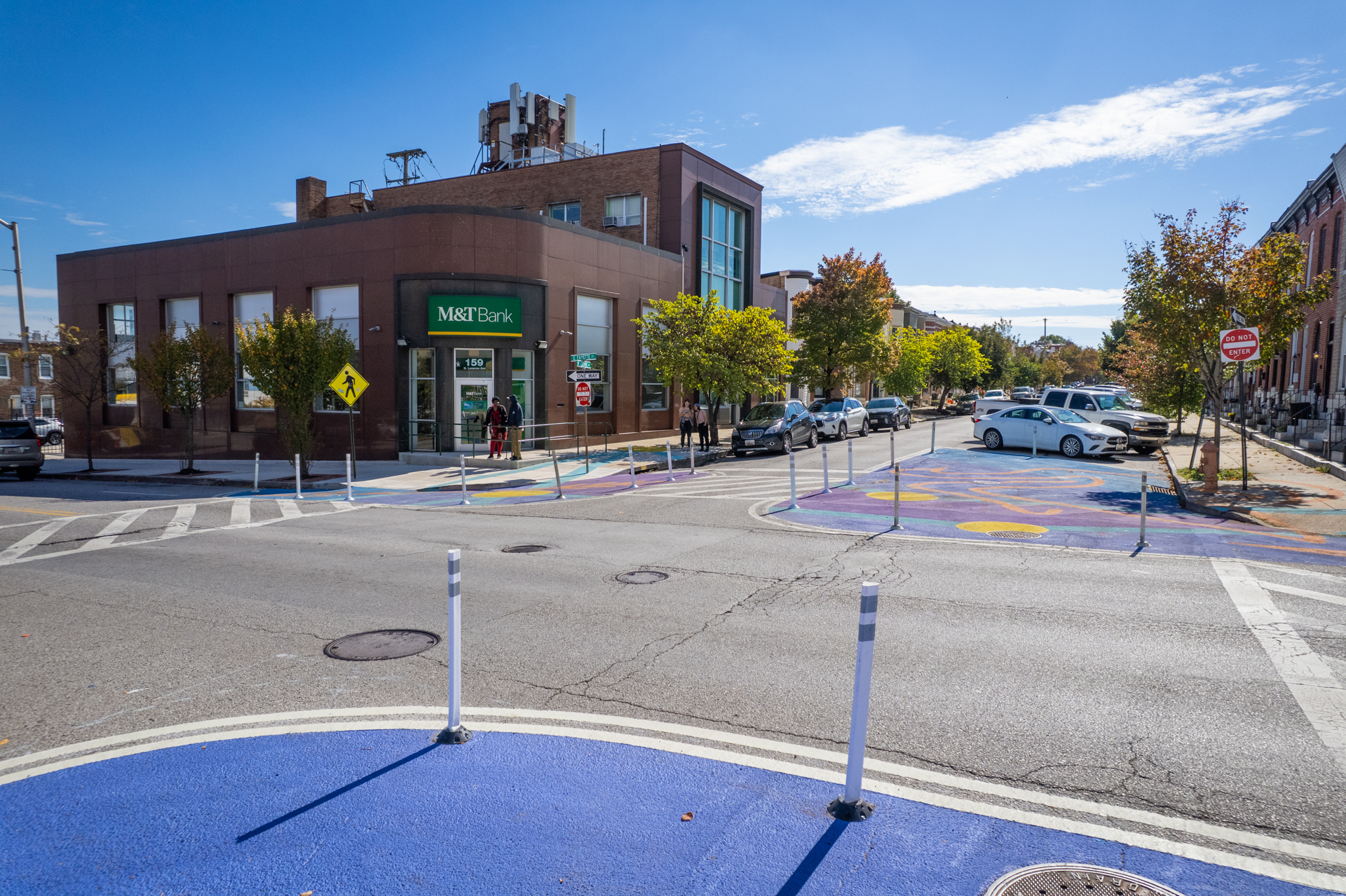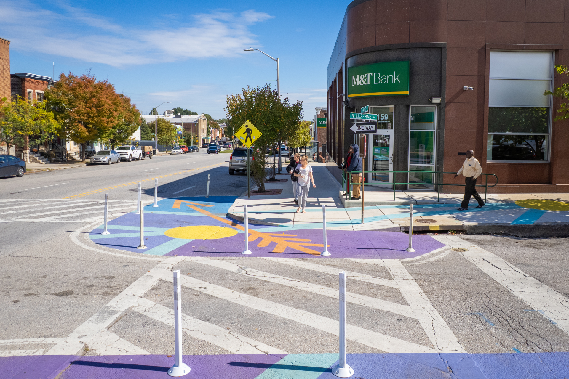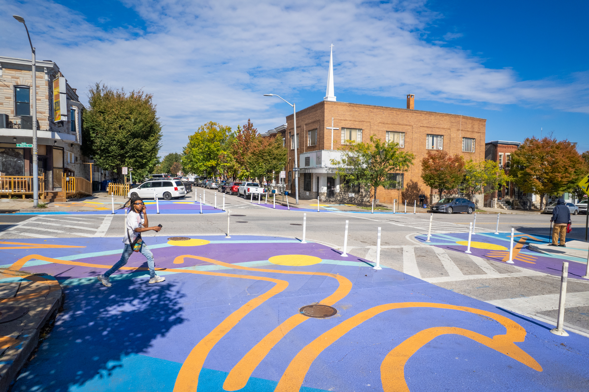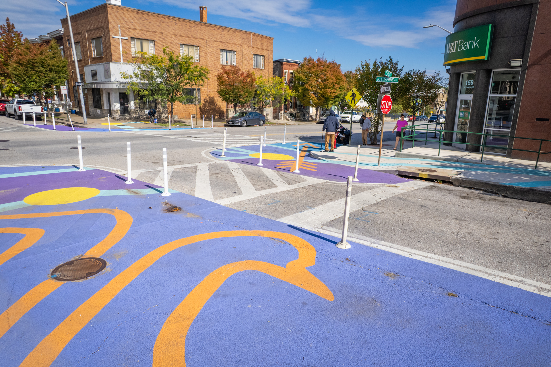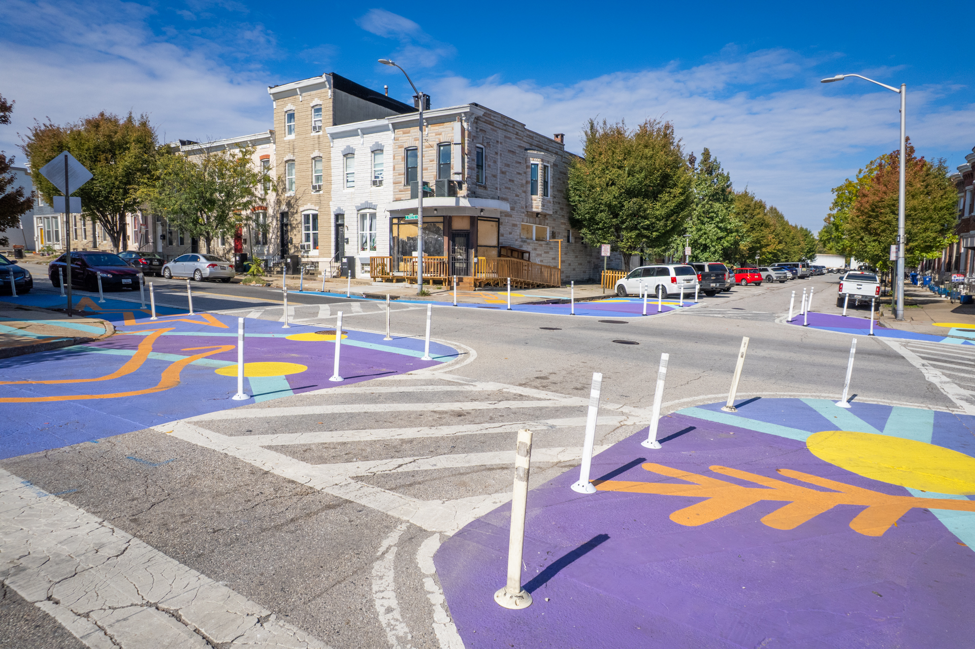 To celebrate the new addition to the neighborhood Patterson Park community members put the final touches on their new artwork at the community paint day. These artistic bumouts will help to slow down traffic, and make this busy intersection safer for both pedestrians and drivers.