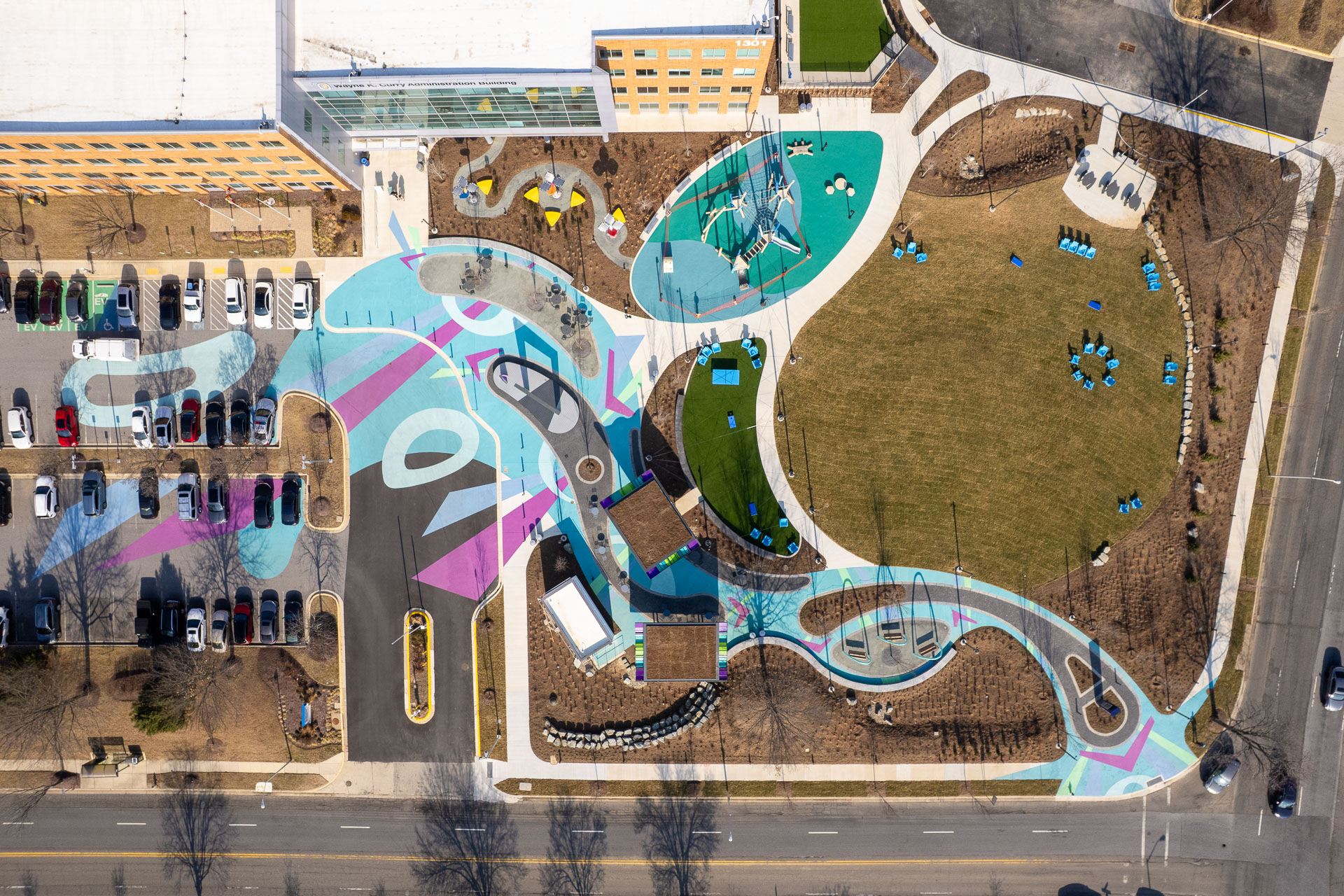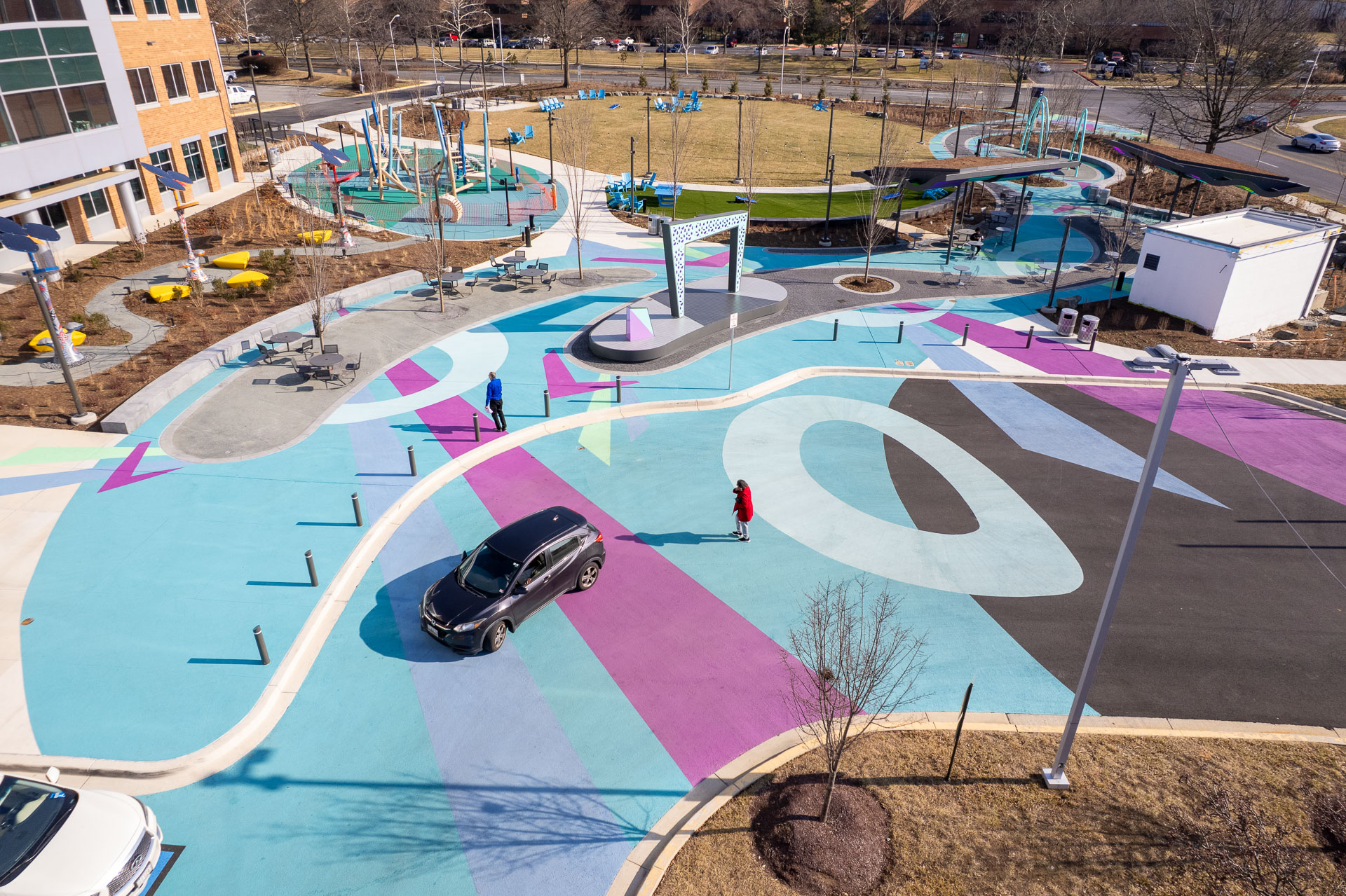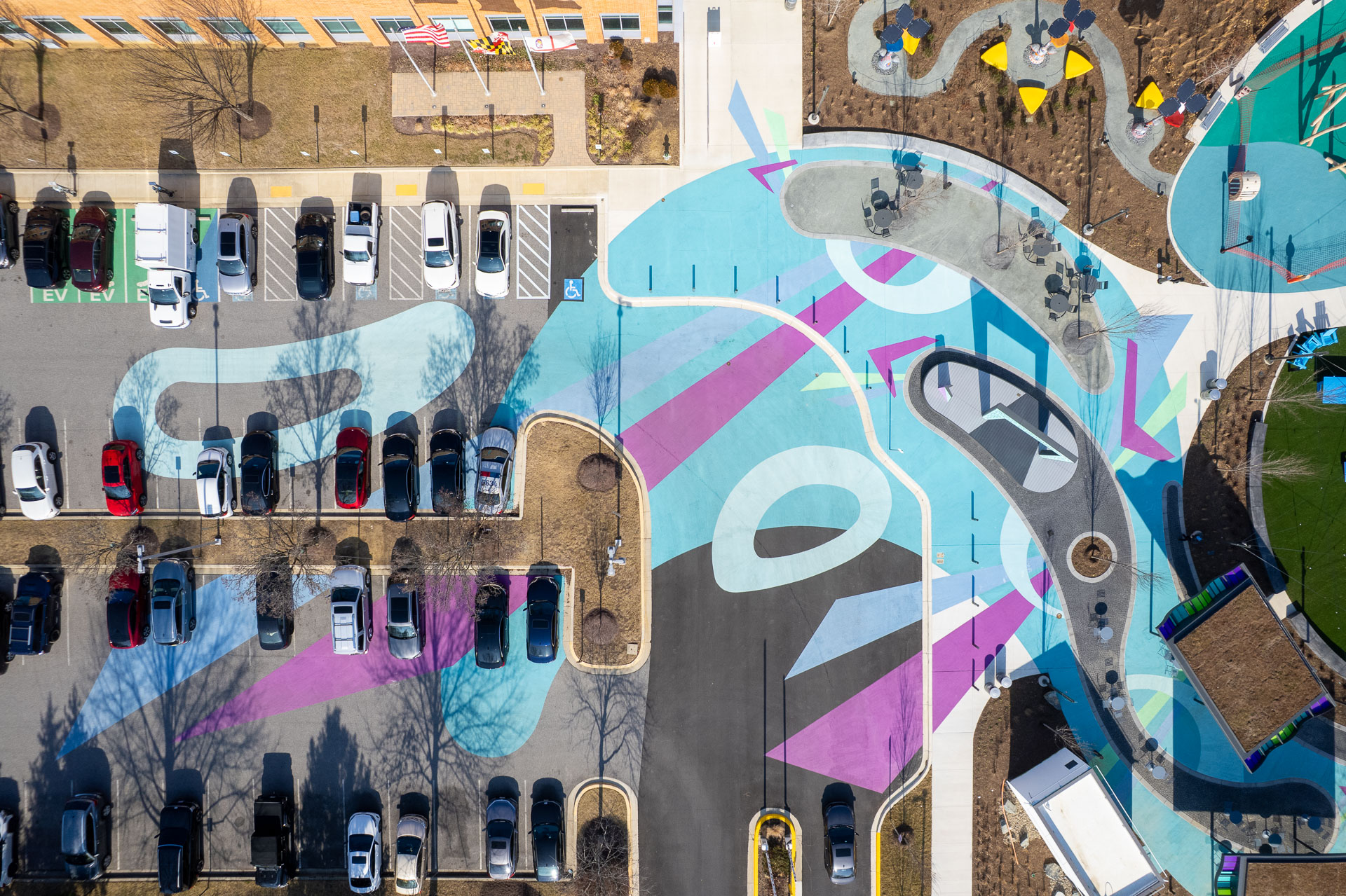 The large-scale Civic Rays pavement mural effectively extends the civic space into the adjacent parking lot. A striking teal background is anchored by a series of island-like light blue ellipses, activated by bold sets of angular blue and green rays, and accented by playful purple chevrons located at key entry points. This unifying design allows the parking lot to also be easily closed and transformed into an extended public space for events such as farmers markets and festivals.