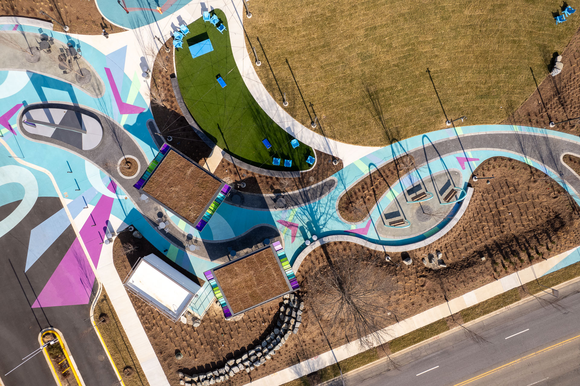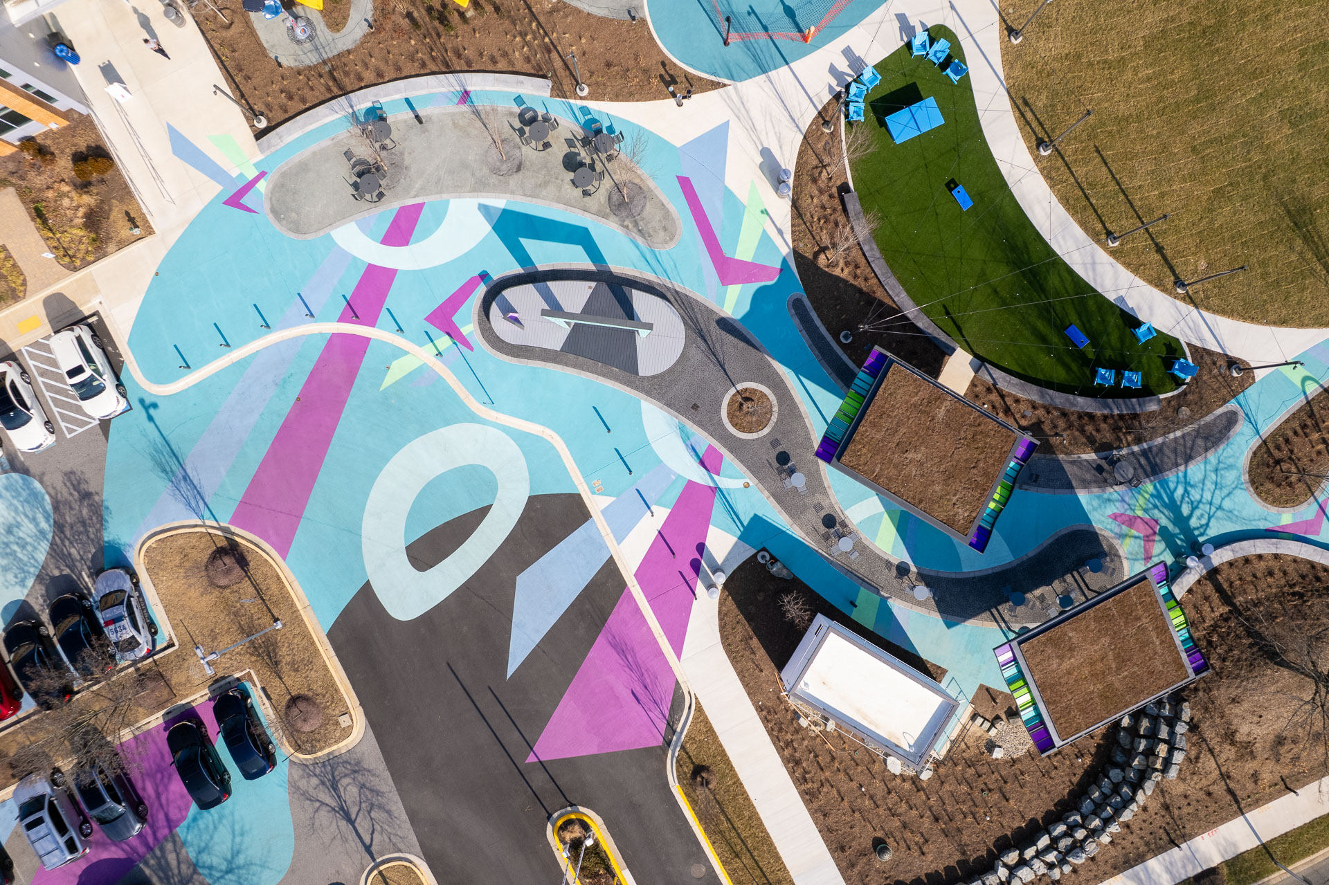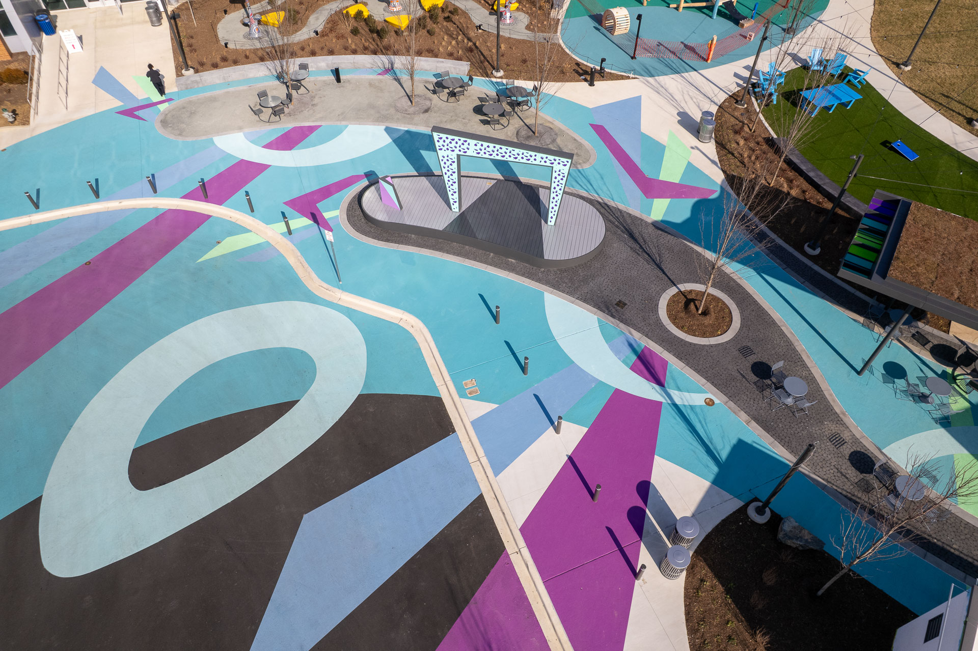 Other works of public art include the re-emergence of local favorite “The Perennials” sculptures by Anaitté Vaccaro, and a prominent utility structure wrapped in a mural by local artist Bryane Broadie. The ground plane is animated by sinuous pathways and a vibrant, 14,000+ square foot custom painted mural that reflects the community’s identity and brings a bold visual character to the plaza.