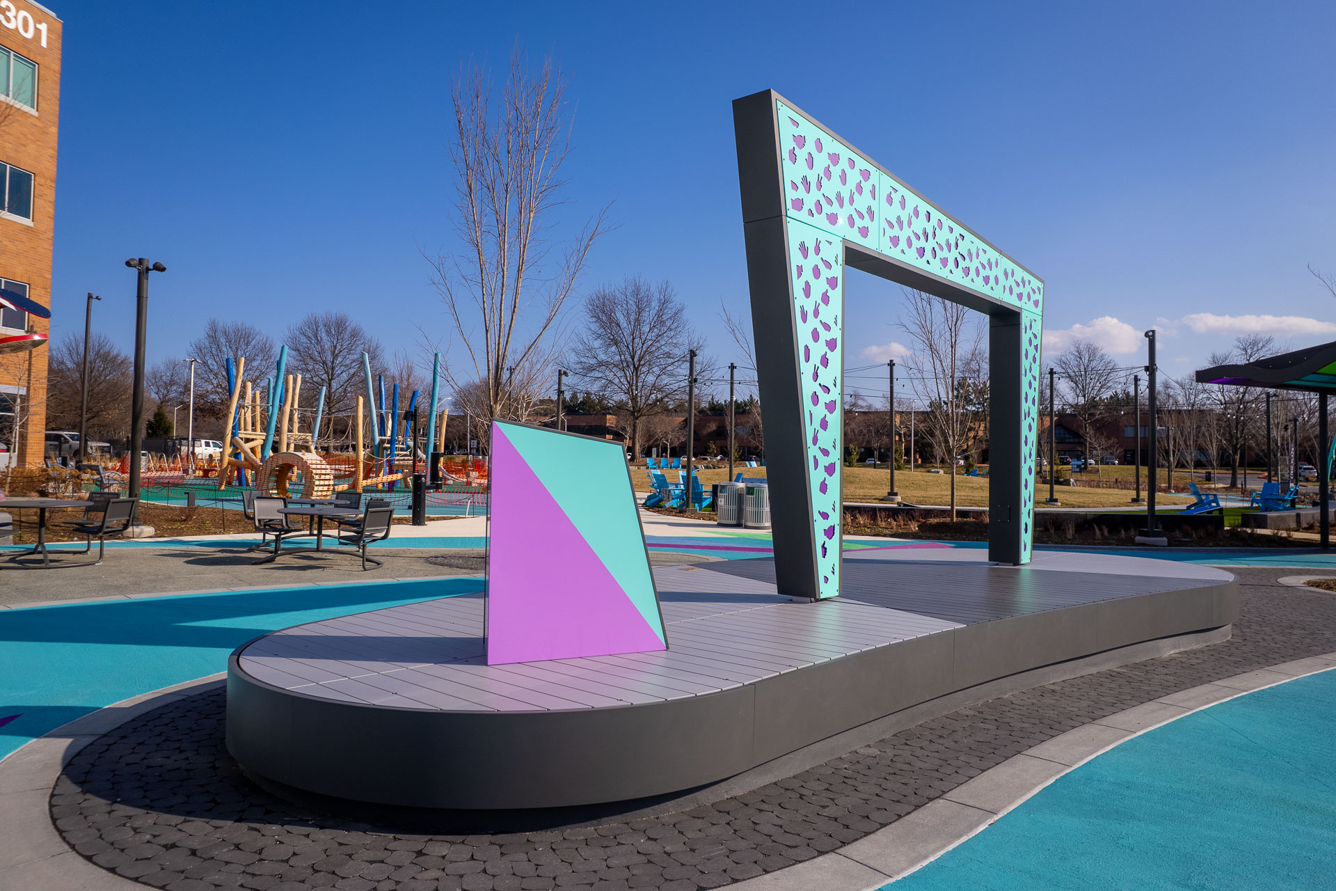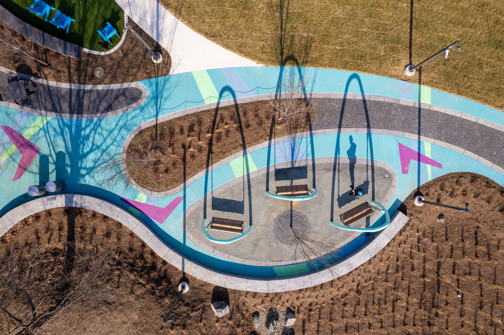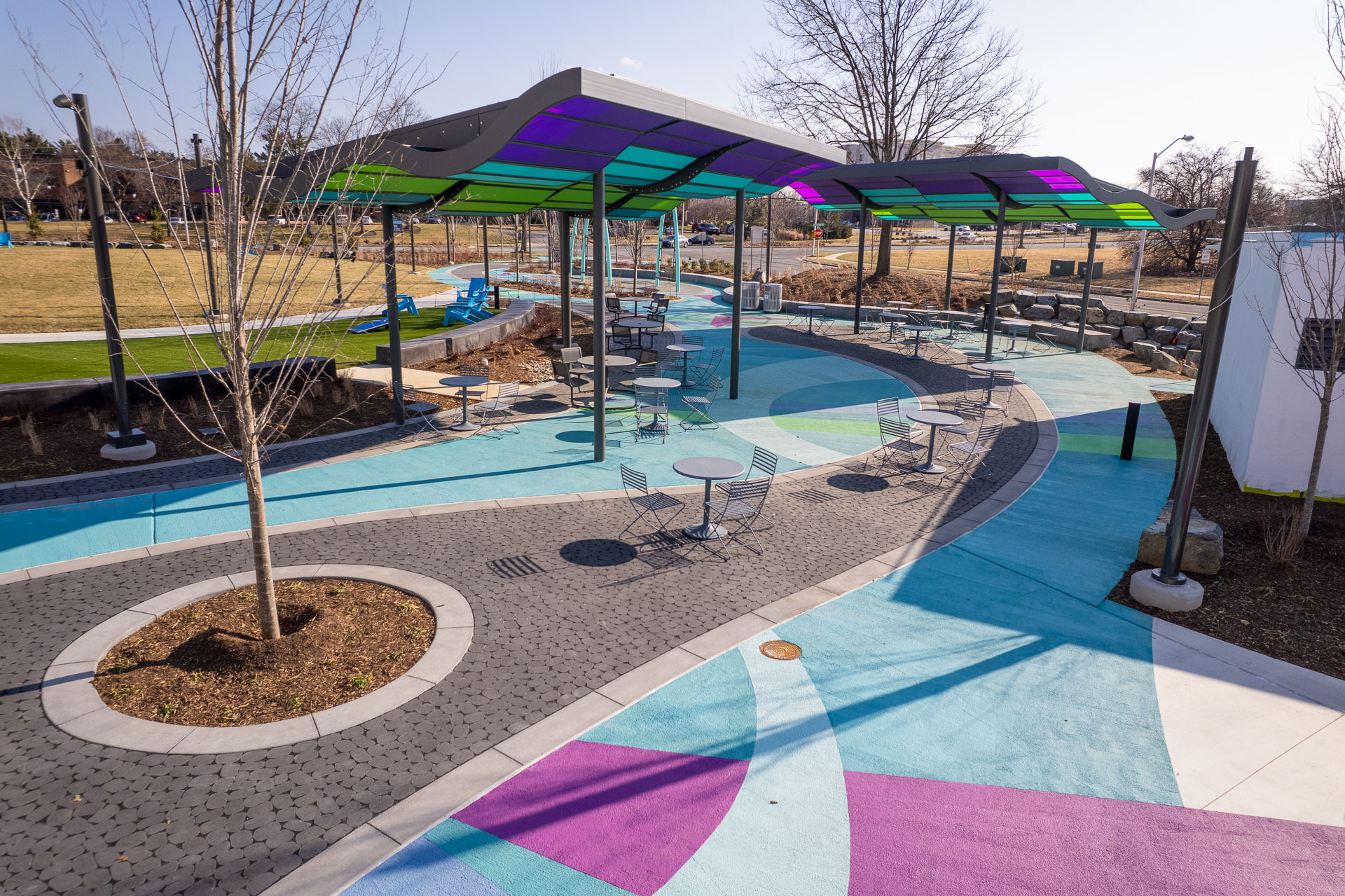 Other works of public art include the re-emergence of local favorite “The Perennials” sculptures by Anaitté Vaccaro, and a prominent utility structure wrapped in a mural by local artist Bryane Broadie. The ground plane is animated by sinuous pathways and a vibrant, 14,000+ square foot custom painted mural that reflects the community’s identity and brings a bold visual character to the plaza.