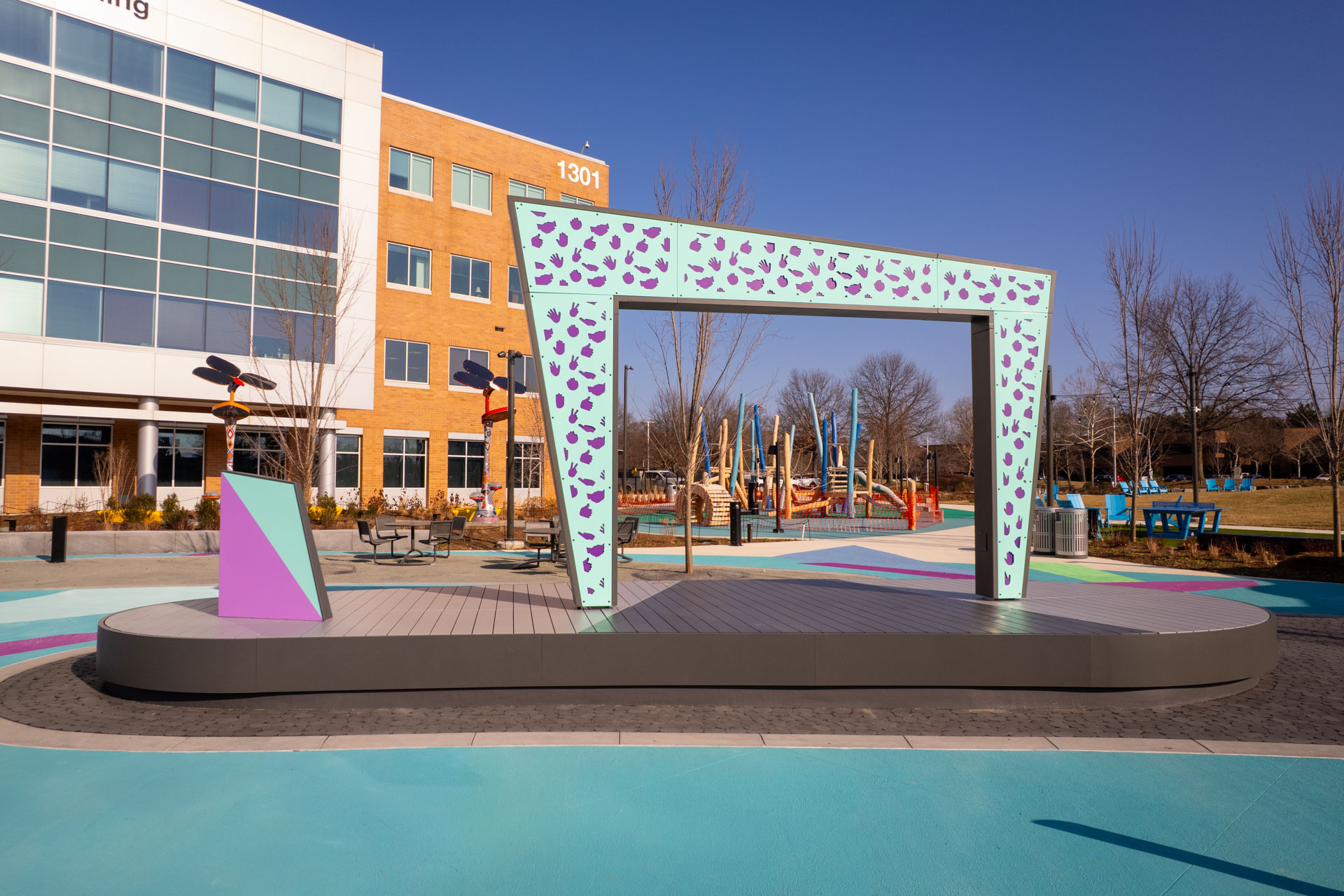 The large-scale pavement mural effectively extends the civic space into the adjacent parking lot. A striking teal background is anchored by a series of island-like light blue ellipses, activated by bold sets of angular blue and green rays, and accented by playful purple chevrons located at key entry points. This unifying design allows the parking lot to also be easily closed and transformed into an extended public space for events such as farmers markets and festivals.