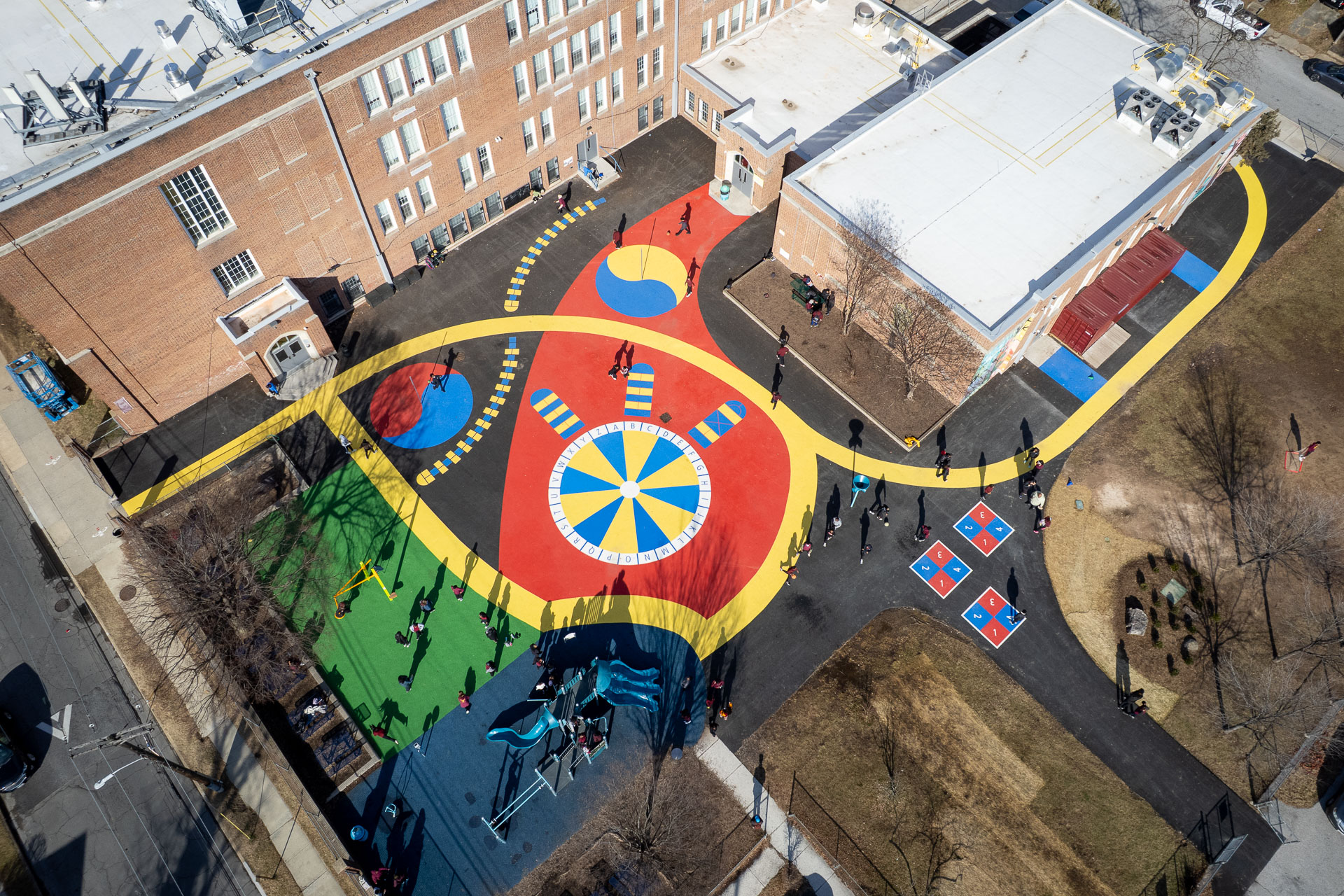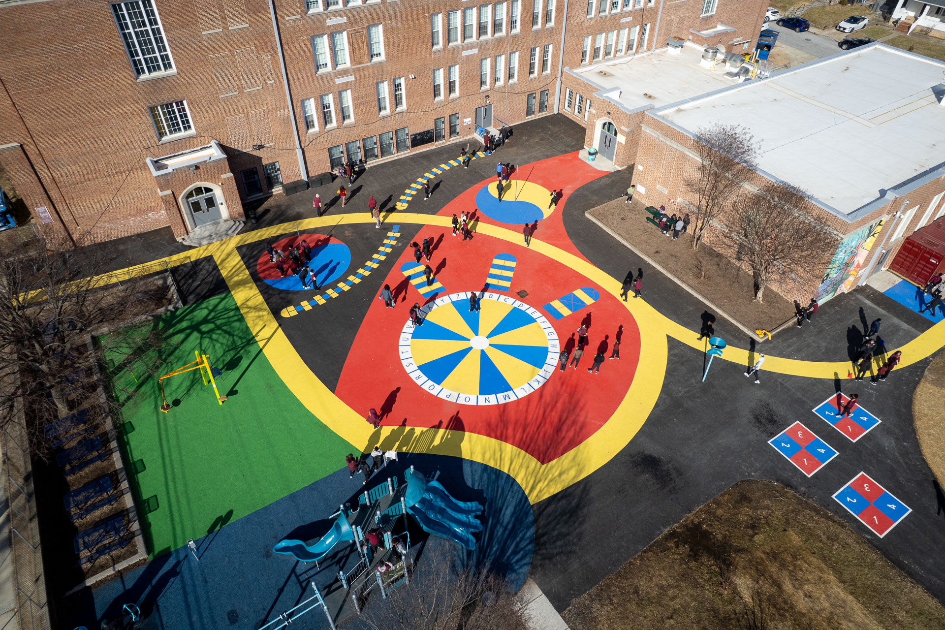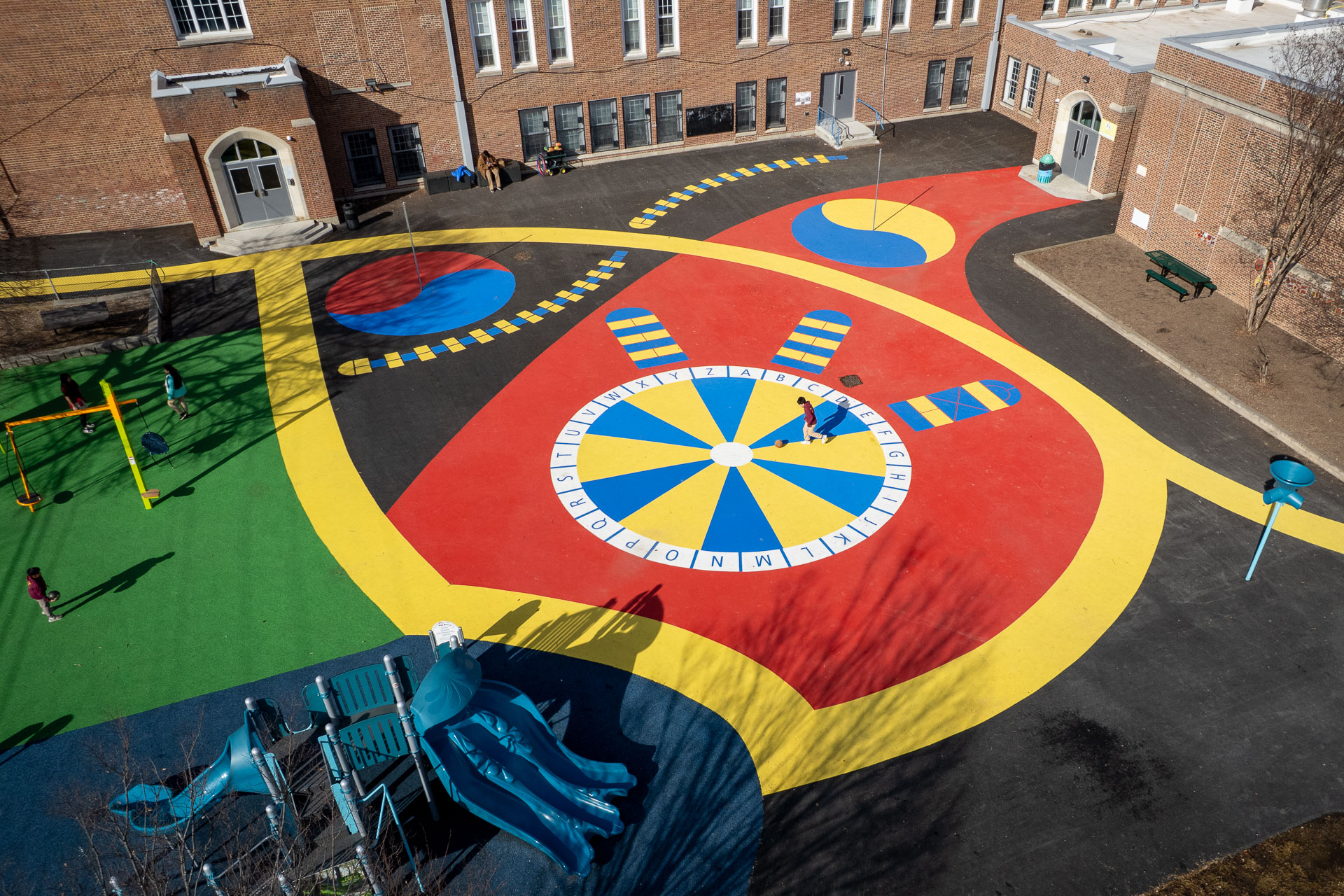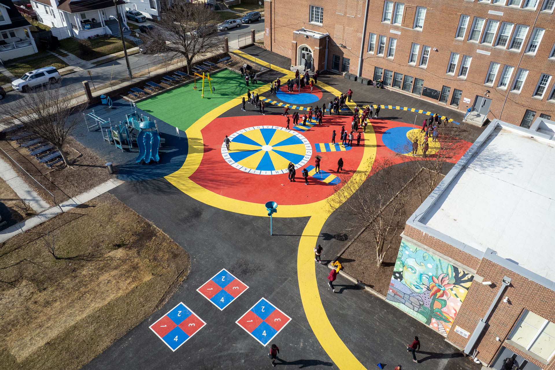 At Baltimore’s Hamilton Elementary/Middle School, Graham Projects helped bring a reimagined schoolyard to life by serving as the pavement art installer alongside construction firm Plano-Coudon. Designed by Floura Teeter and shaped through community vision planning led by Parks & People, the project includes 6,600 square feet of custom pavement art integrated throughout the outdoor space, transforming everyday movement and play into colorful, active experiences for students. A winding path connects school entrances to different activity areas, while painted game spaces like an alphabet wheel, hopscotch ladders, four-square, and tetherball courts invite play across the schoolyard. A playground area with a rubberized surface adds another layer of safe, active space for students. The path continues to the northeast corner of the schoolyard to a natural grass field, offering open space for free play and group activities.