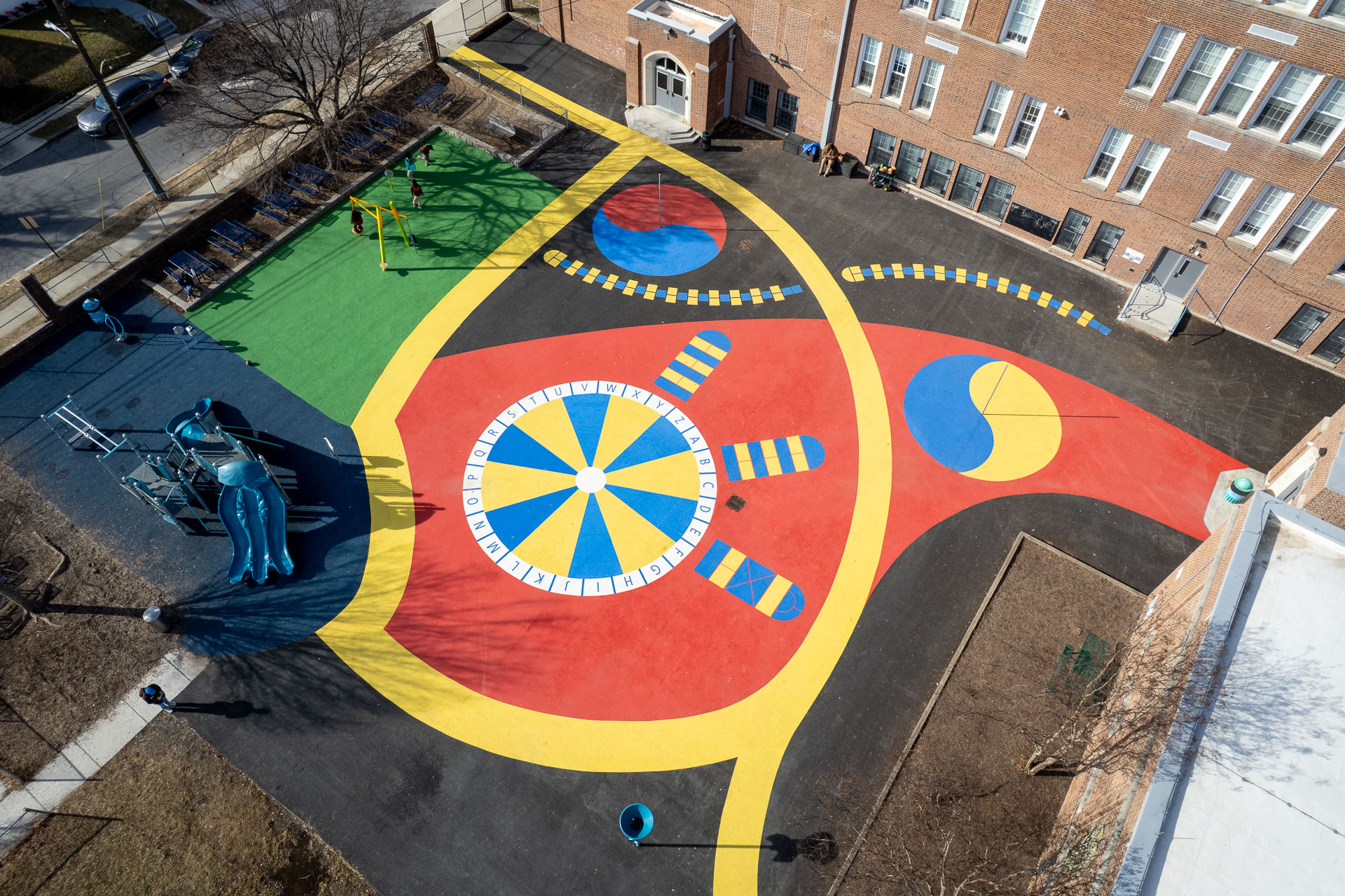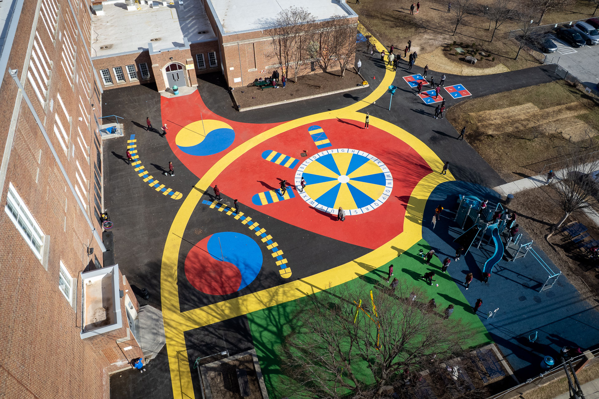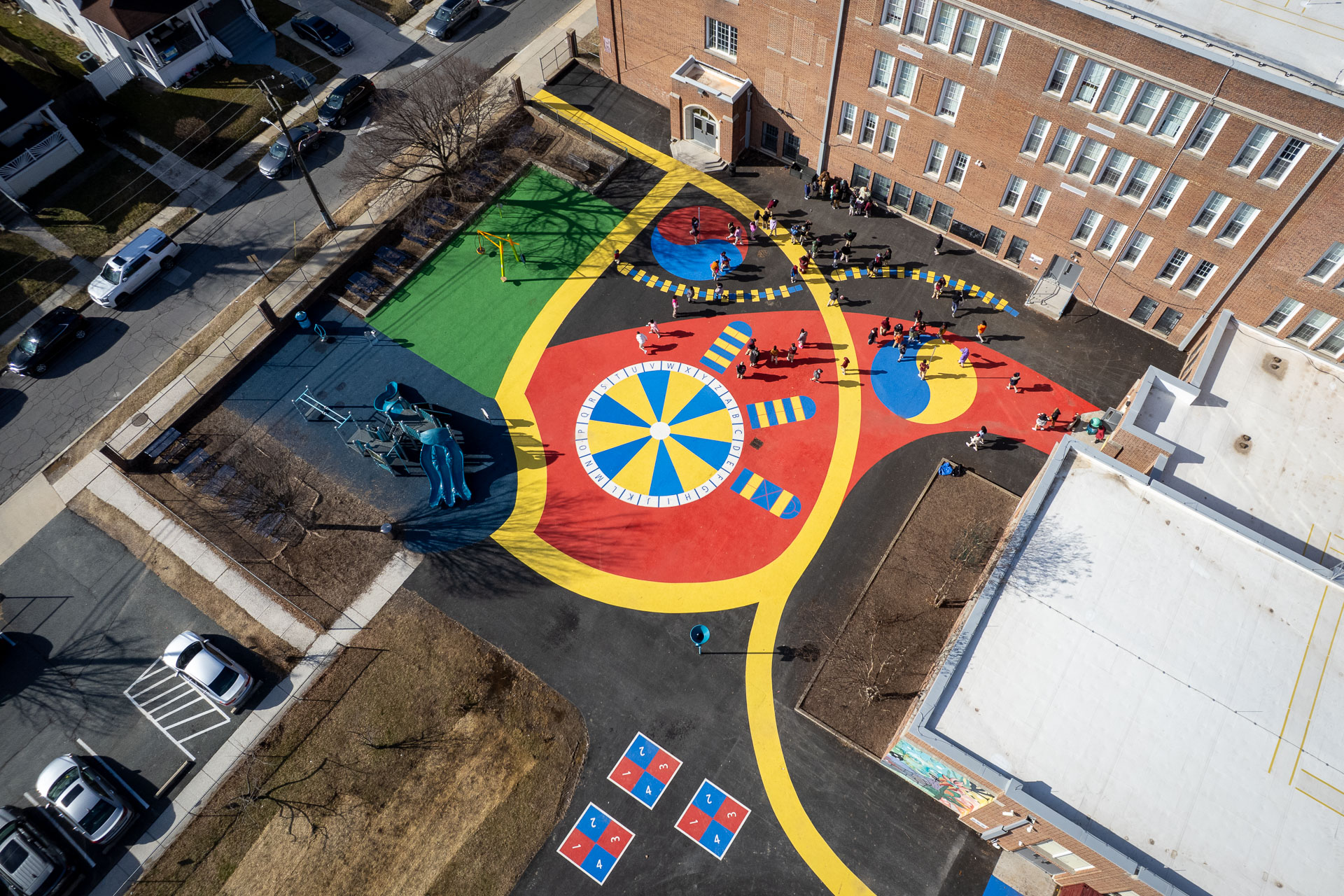 At Baltimore’s Hamilton Elementary/Middle School, Graham Projects helped bring a reimagined schoolyard to life by serving as the pavement art installer alongside construction firm Plano-Coudon. Designed by Floura Teeter and shaped through community vision planning led by Parks & People, the project includes 6,600 square feet of custom pavement art integrated throughout the outdoor space, transforming everyday movement and play into colorful, active experiences for students. A winding path connects school entrances to different activity areas, while painted game spaces like an alphabet wheel, hopscotch ladders, four-square, and tetherball courts invite play across the schoolyard. A playground area with a rubberized surface adds another layer of safe, active space for students. The path continues to the northeast corner of the schoolyard to a natural grass field, offering open space for free play and group activities.