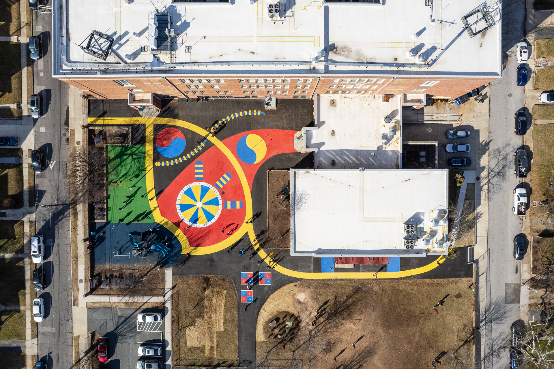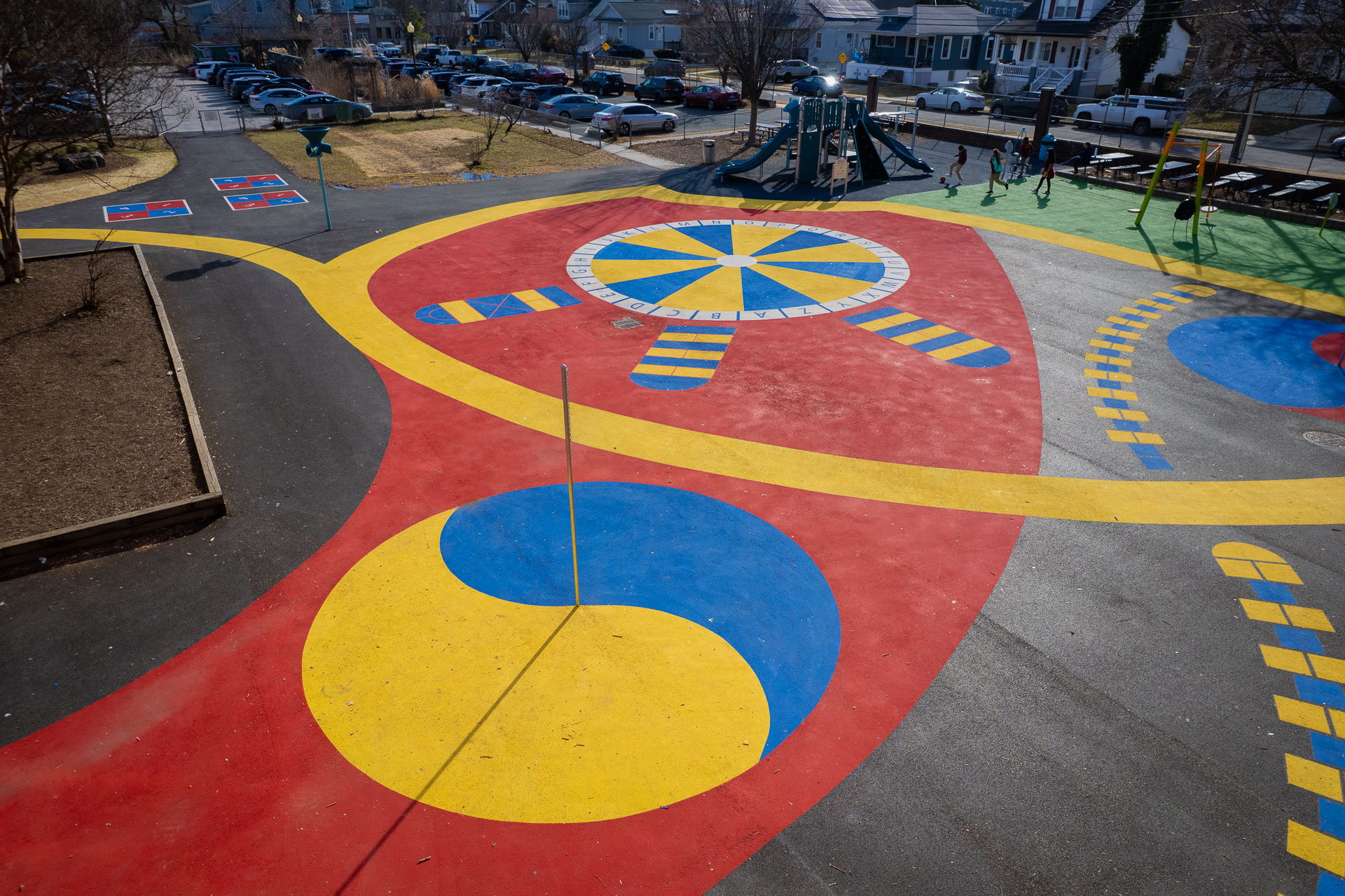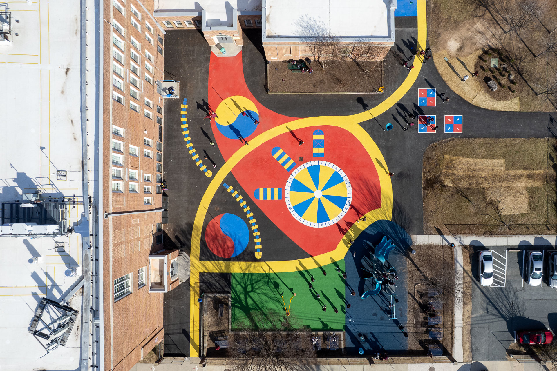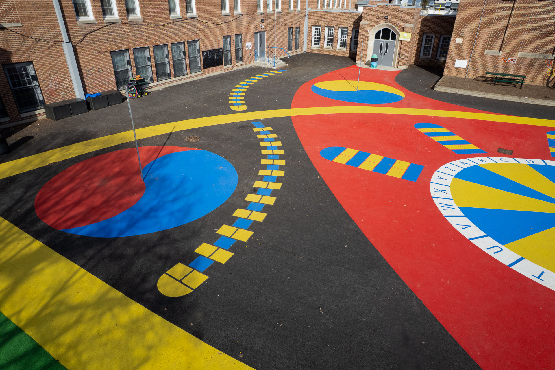 At Baltimore’s Hamilton Elementary/Middle School, Graham Projects helped bring a reimagined schoolyard to life by serving as the pavement art installer alongside construction firm Plano-Coudon. Designed by Floura Teeter and shaped through community vision planning led by Parks & People, the project includes 6,600 square feet of custom pavement art integrated throughout the outdoor space, transforming everyday movement and play into colorful, active experiences for students. A winding path connects school entrances to different activity areas, while painted game spaces like an alphabet wheel, hopscotch ladders, four-square, and tetherball courts invite play across the schoolyard. A playground area with a rubberized surface adds another layer of safe, active space for students. The path continues to the northeast corner of the schoolyard to a natural grass field, offering open space for free play and group activities.