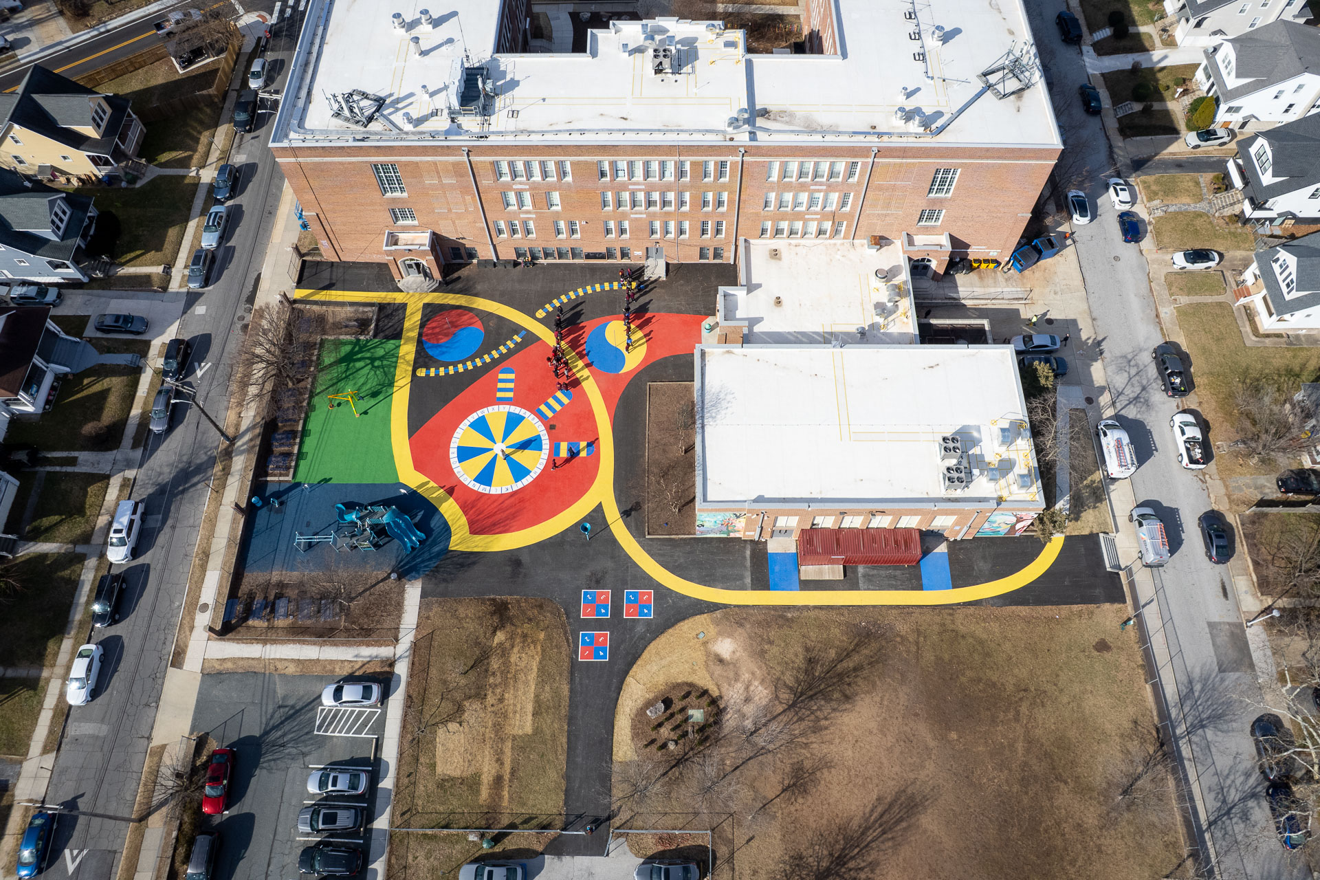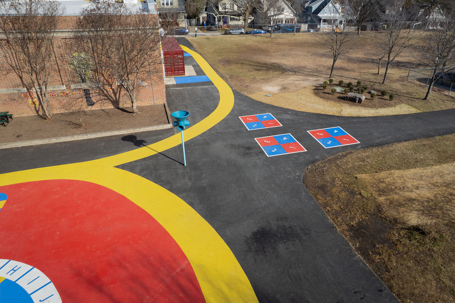 Together, the colors, paths, and play elements create a schoolyard that feels active, welcoming, and easy to navigate. The project highlights how pavement art can support safer school spaces while helping build a strong sense of place for students and the surrounding northeast Baltimore community.