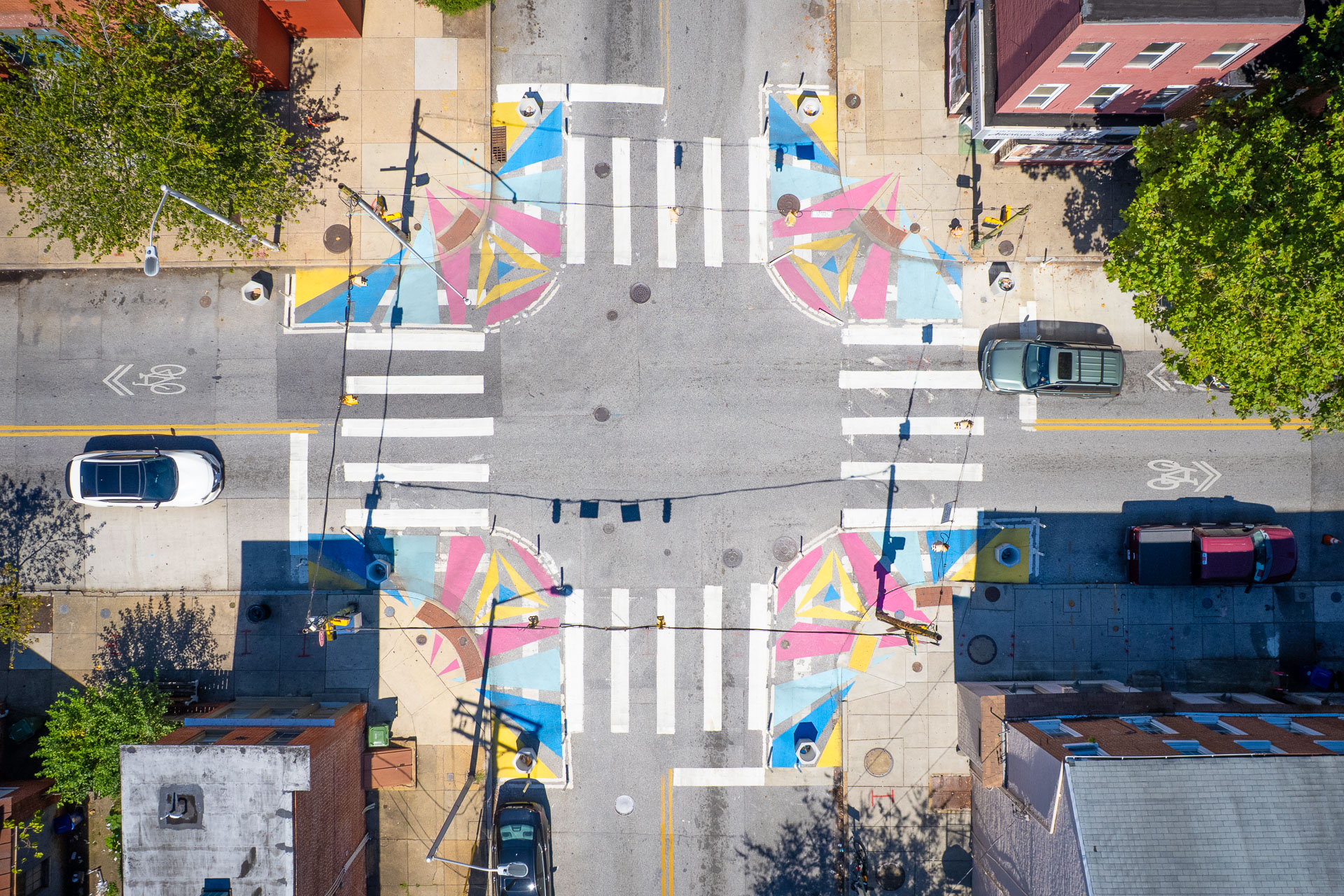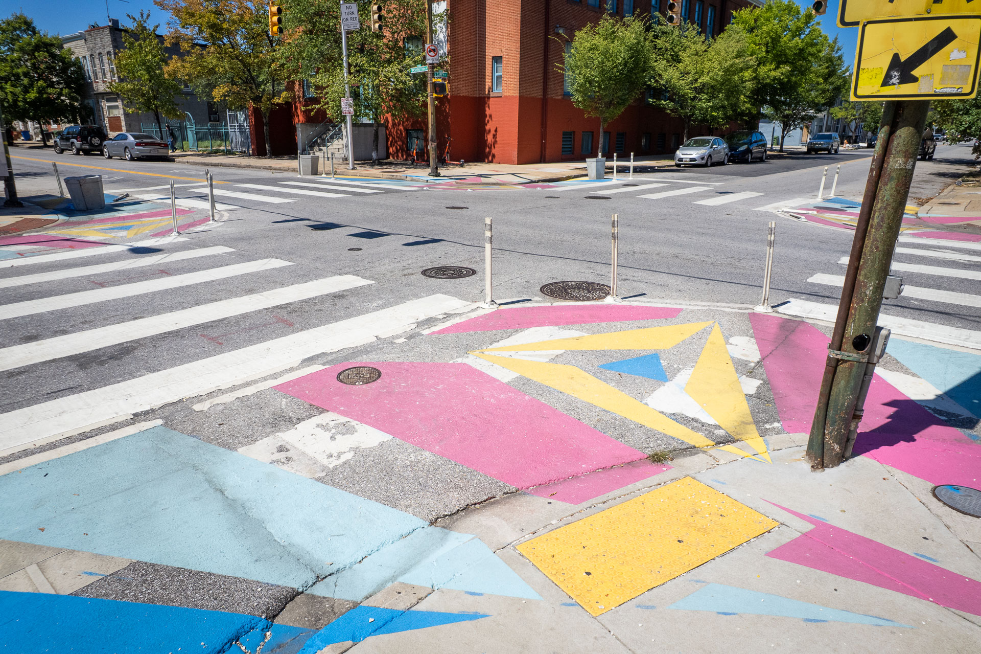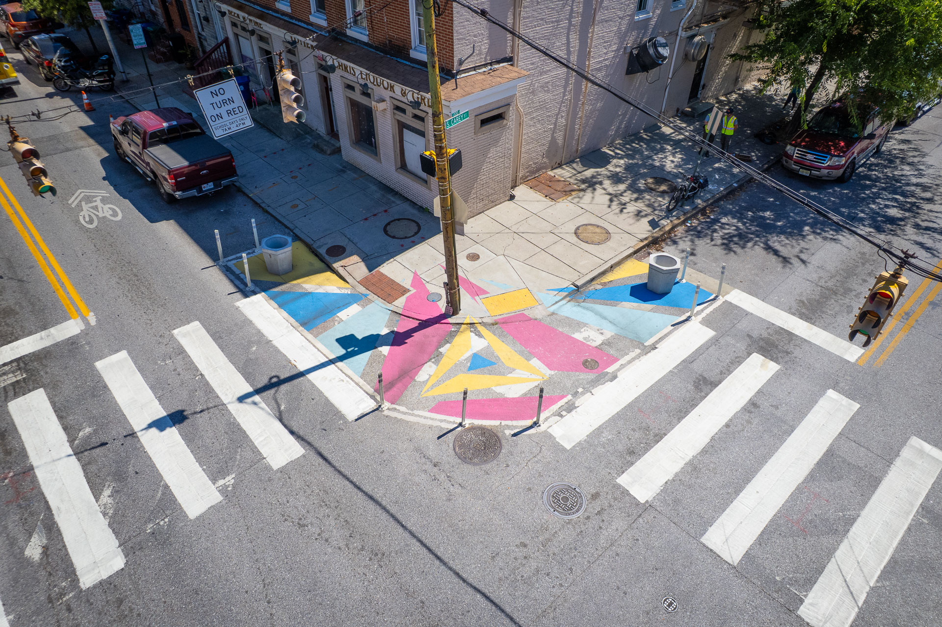 Crossing at Baltimore’s Washington Boulevard & Carey Street now comes with a pop of Pigtown flair thanks to the Open Aperture mural. The concentric triangles design is inspired by the geometry of a camera shutter; framing the street in bold movement and accented with the bright pink of Pigtown Main Street. The triangles of the aperture reach past the bump outs to the sidewalks, pulling pedestrians in with its motion. The installation wrapped up with a community planter paint day—giving neighbors a chance to leave their mark and celebrate these refreshed public spaces together. A vibrant design with a traffic-calming function, Open Aperture makes this intersection safer and more welcoming for everyone.