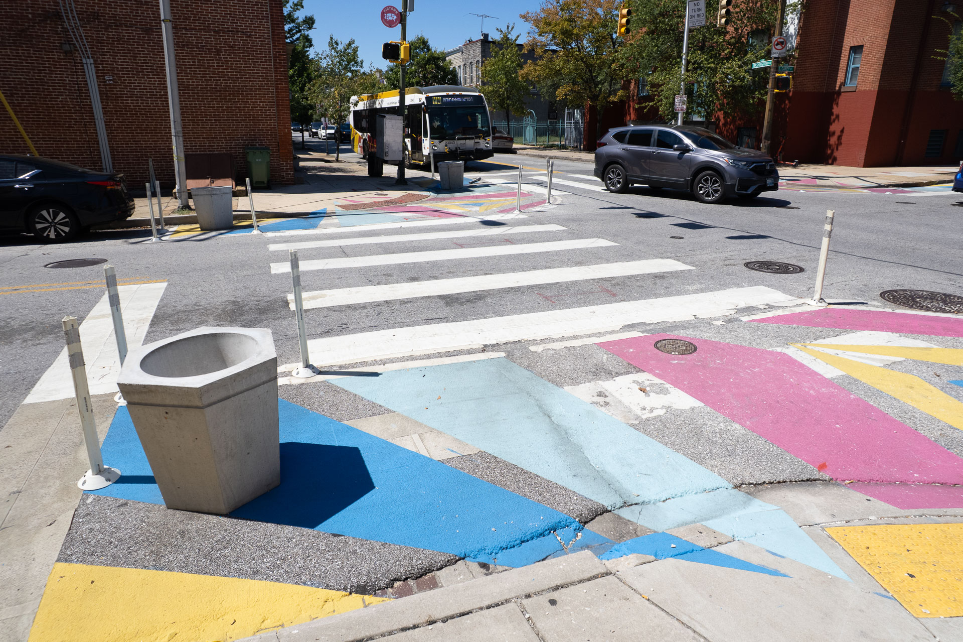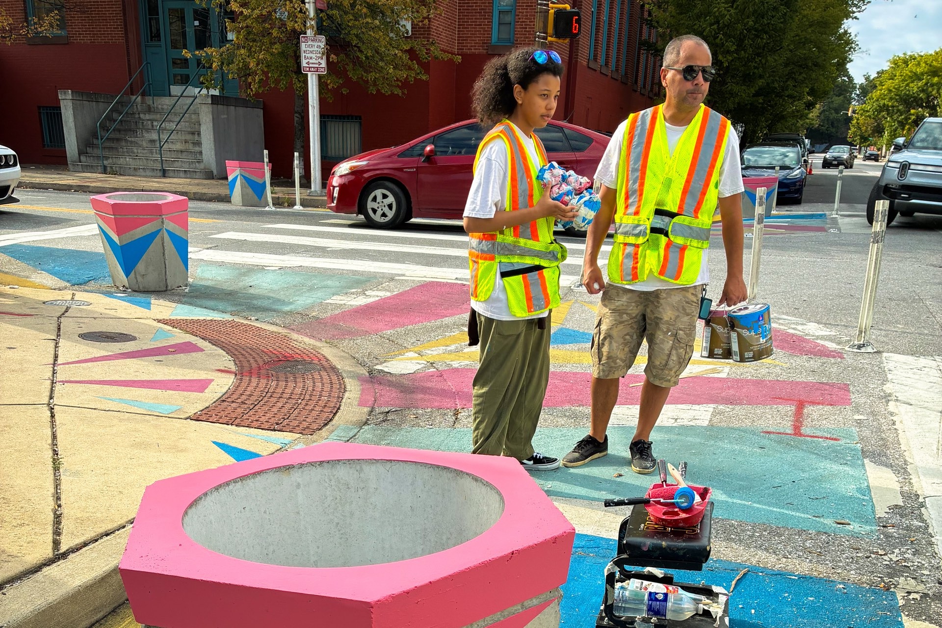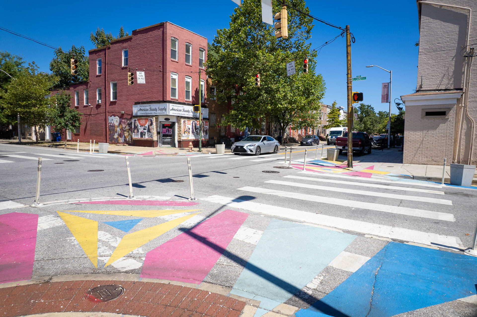Crossing at Baltimore’s Washington Boulevard & Carey Street now comes with a pop of Pigtown flair thanks to the Open Aperture mural. The concentric triangles design is inspired by the geometry of a camera shutter; framing the street in bold movement and accented with the bright pink of Pigtown Main Street. The triangles of the aperture reach past the bump outs to the sidewalks, pulling pedestrians in with its motion. The installation wrapped up with a community planter paint day—giving neighbors a chance to leave their mark and celebrate these refreshed public spaces together. A vibrant design with a traffic-calming function, Open Aperture makes this intersection safer and more welcoming for everyone.