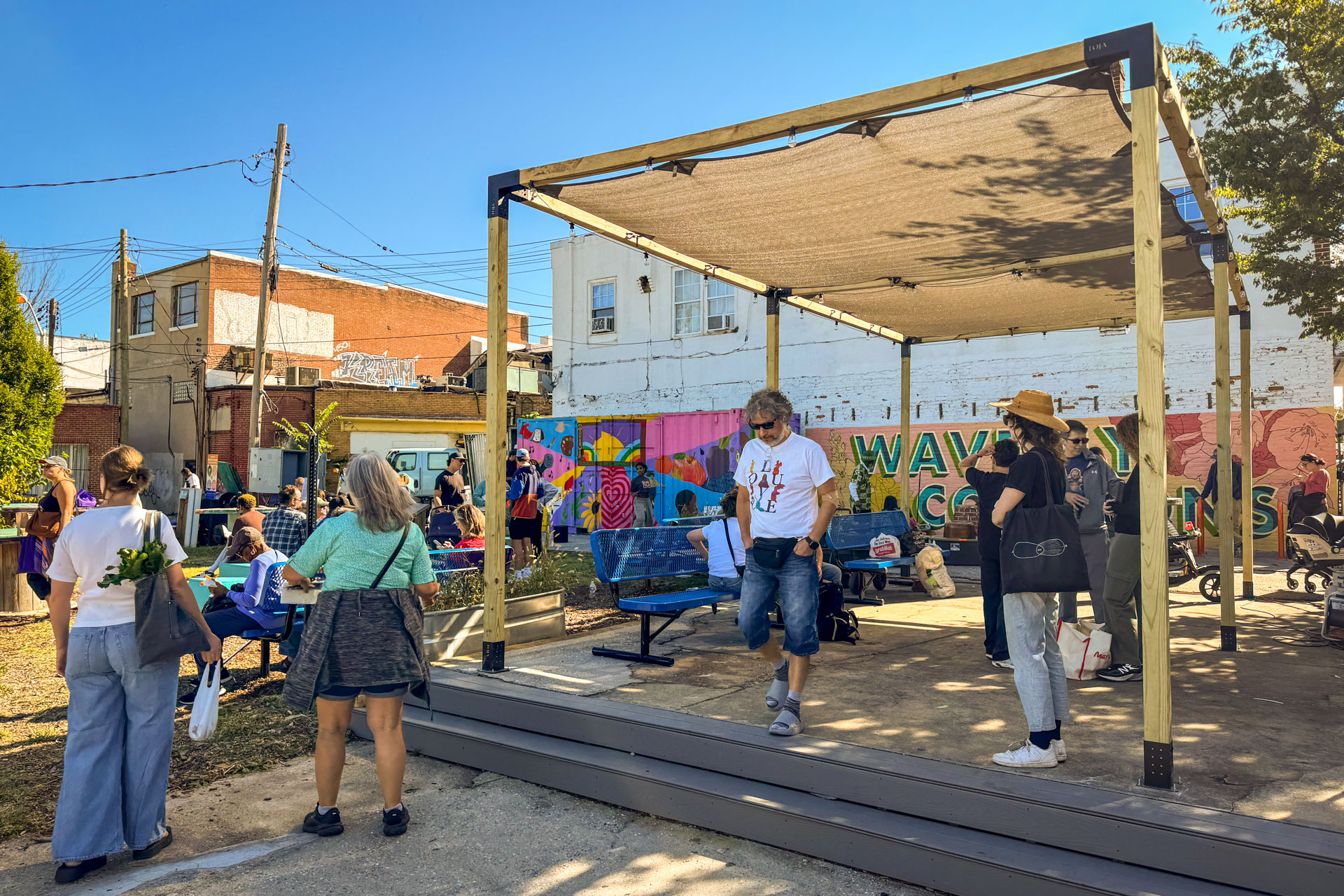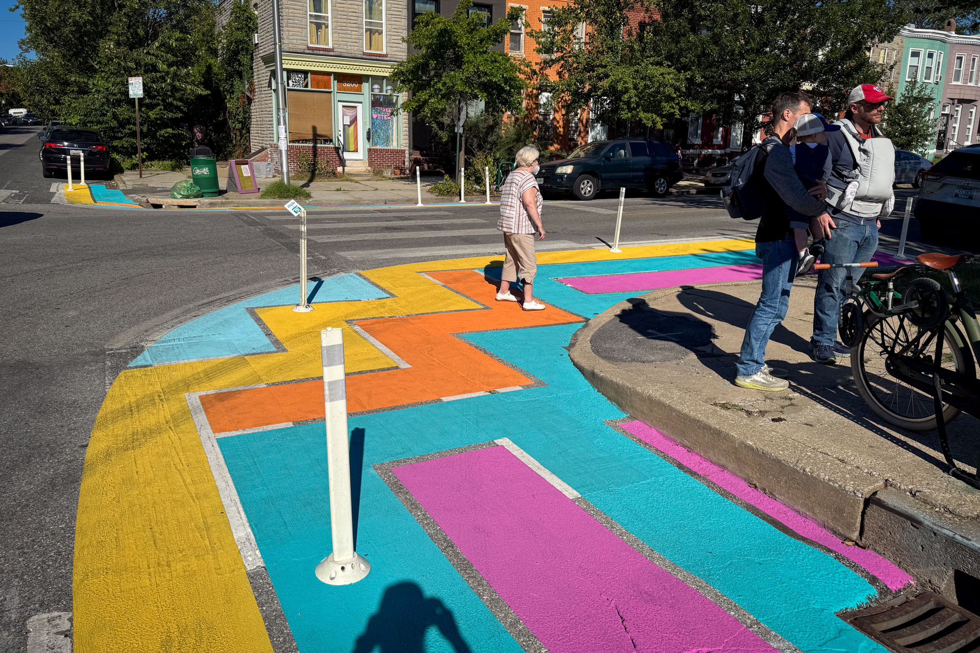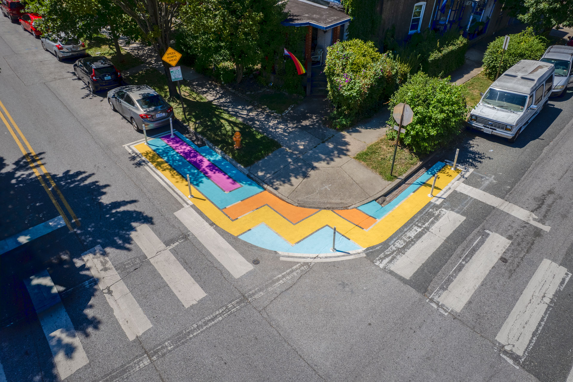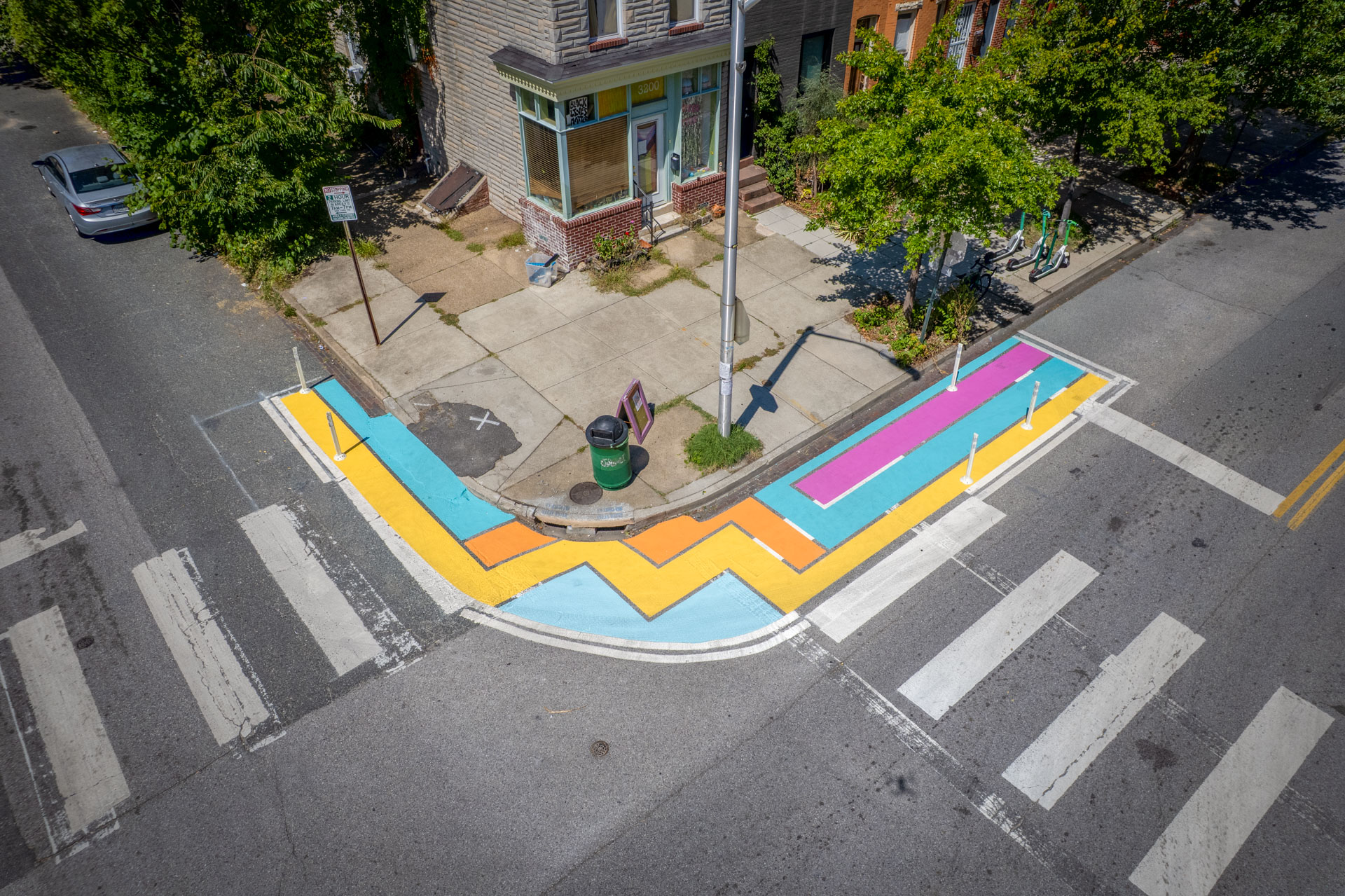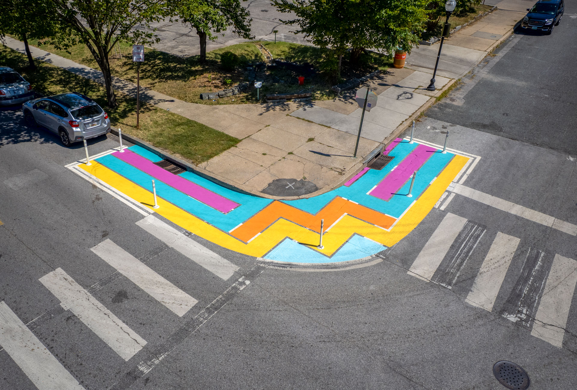 The pavement mural, Woven Walk, features a vibrant pattern of lemon yellow, golden orange, turquoise green, rose violet, and baby blue representing the diversity and strength of Waverly, Abell, and surrounding neighborhoods. Embedded in the pattern are abstracted letters including “W” for Waverly, “F” for Farmers, “M” for Market.
